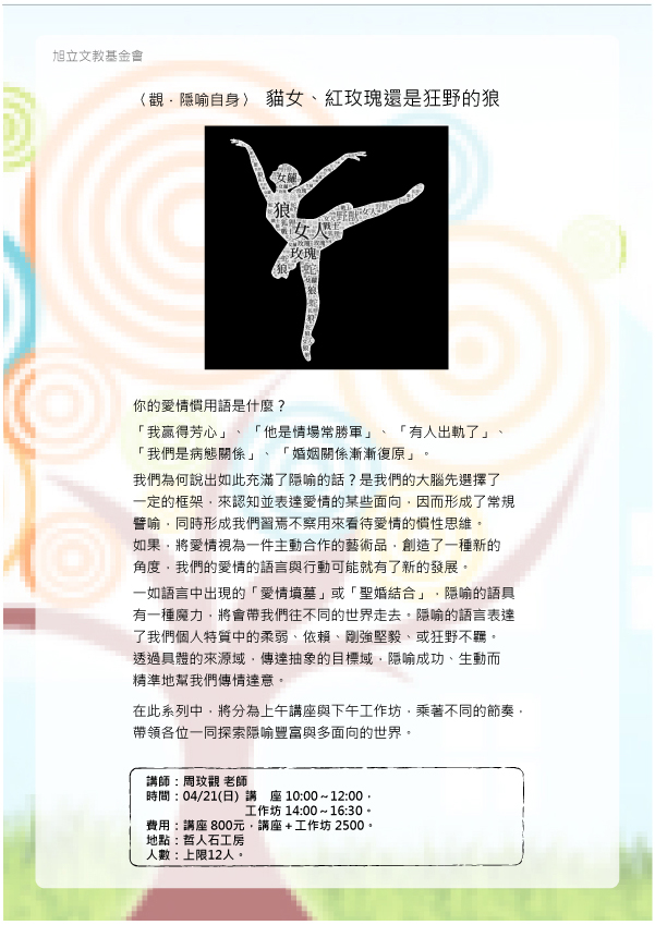 時間:講座 10:00~12:00,工作坊 14:00~16:30。